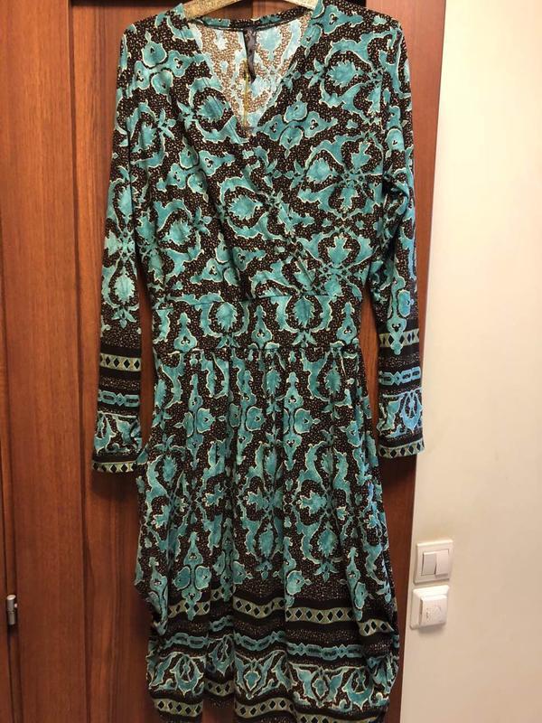 Красивое платье Studio коричневого цвета с бирюзовым рисунком, платье очень необычное, мягкий и приятный материал. Отлично подойдёт на весну-очень. Талия на резинке, два скрытых кармана на бёдрах. Размер L, длинна 105см., плечи 38см., объём груди 90-104см., талия 72-84см., бёдра 134-154см., длинна рукава 62см. Платье эластичное, хорошо тянется, зона декольте "на запах" подойдёт на любую грудь. Платье новое, с этикеткой.