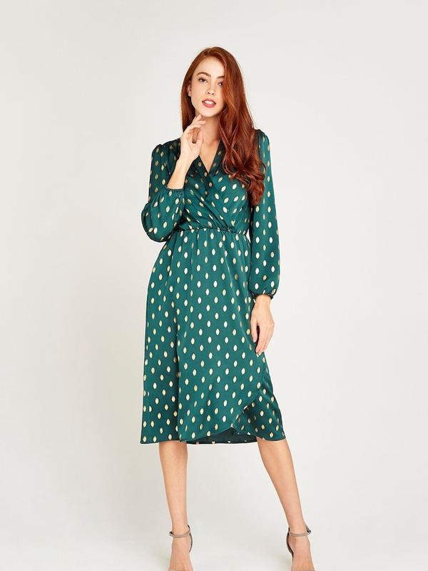Сукня смарагдового кольору, імітація на запах, талія на резинці. Розмір 14 буде і на більший розмір. Заміри: Пог 48/58 см. Пот 35/55 см. Довжина 112 см.