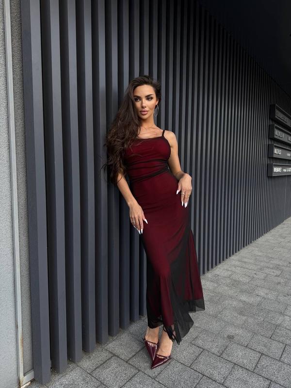 Вишукана бордова сукня міді з чорною сіткою на бретельках силуетна хс-с (42-44), м-л (46-4...