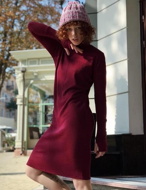 Теплое бордовое платье миди с длинными рукавами митенками