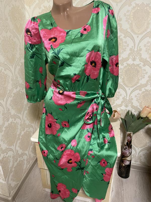 Гарна квіткова сукня, тканина по типу атласу, актуальна модель, збоку регулюється поясом . Дуже классно виглядає. Розмір вказаний 14,евро 42 ПОГ-50-52 ПОТ-40-44 сзаду резинка ПОБ-57 Довжина-120 см