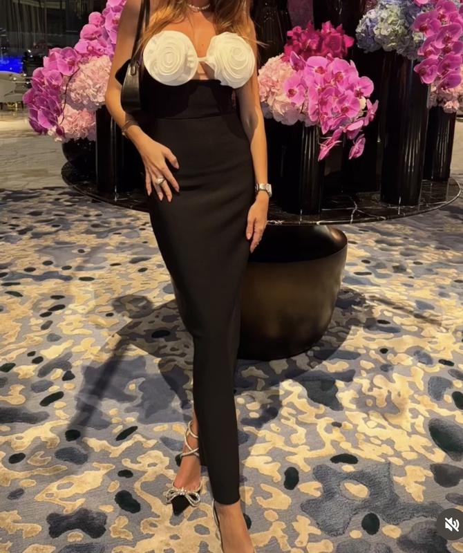 Елегантна чорна сукня з довгою спідницею та білим топом із об’ємними квітами. Модель на тонких бретелях, підкреслює фігуру та додає образу жіночності й шарму. Ідеальний вибір для вечірнього виходу чи святкової події.