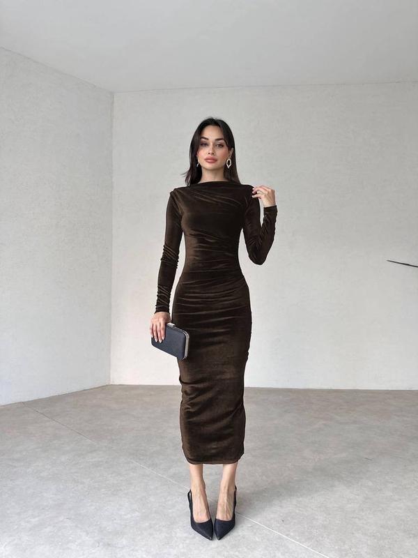 Шоколадна (коричнева) оксамитова бархатна сукня міді з довгими рукавами 5467 с, м, л, хл