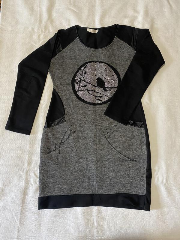 Сукня з картинкою із страз «Пташка». Деяких камінців немає, але на загальний вигляд картинки це не впливає. Має кишеньки з обох боків (є на фото). Розмір М, підходить на вільний S. Плечі - 40 см. Ширина (під пахвами) - 50 см. Талія - 41 см. Довжина - 84 см.