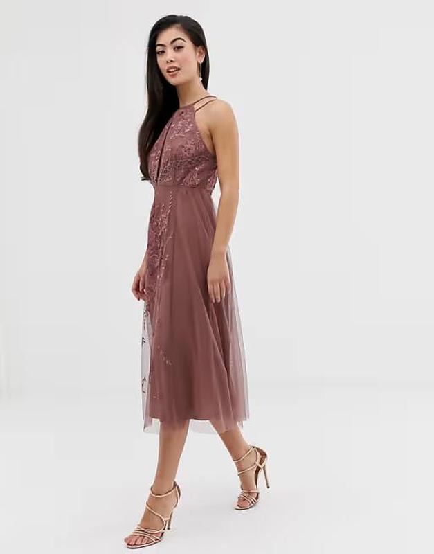 Платье миди от Asos design petite с вышивкой и двойными бретельками, красивая спинка полуоткрытая, на пуговицах. размер 34/Xs/Элегантного шоколадного цвета