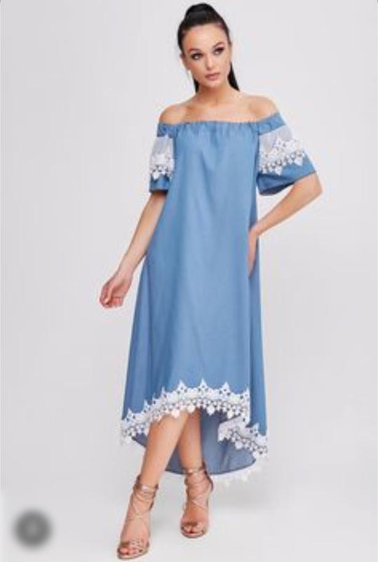Красивое платье с шикарным кружевом. Можно носить как обычно, можно делать плечи спущенными. Спинка длиннее переда. Пояса в наличии нет. Замер и состав на фото. Тканина тягнеться. По запросу выполните дополнительные фото и замеры.