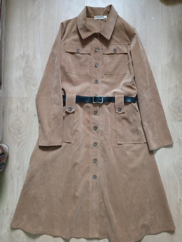 Вельветова сукня одягнена один раз. Модный цвет, красивый фасон. на пуговицах и с поясом. длина 105 рукав 58 полуобхват груди 46 полуобхват талии 42