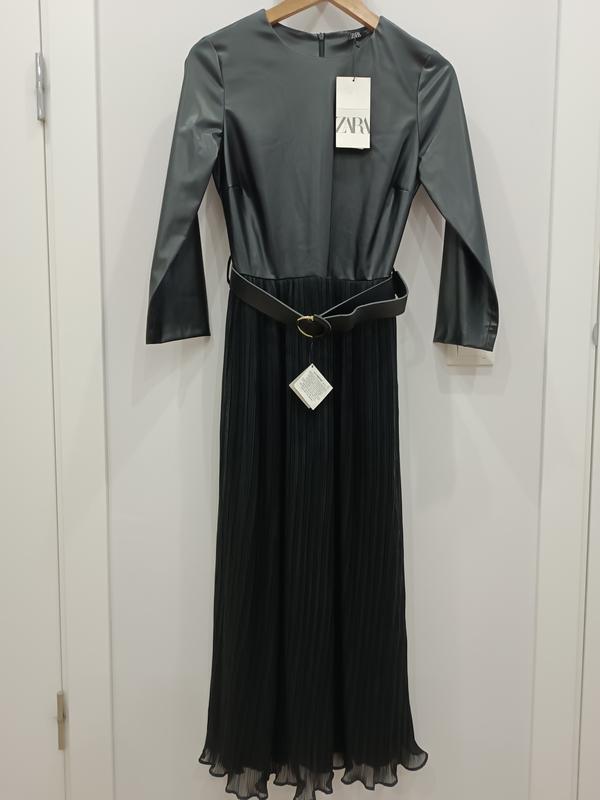 Платье Zara, черного цвета, верх экокожа, низ шифон, с поясом.