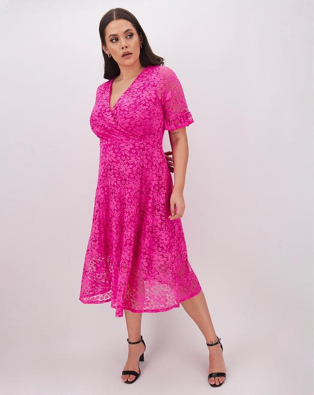 Сукня насичено-рожевого кольору. Мереживо гіпюр стрейчевий, на підкладці. V образний виріз. Присутня картонна бірка Розмір 18/євро 46 Заміри: Пог 54-65 Довжина 120 см.