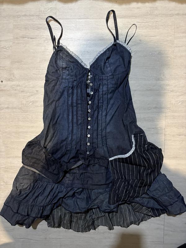 Гарна сукня для емо чи готок матеріал тіпа джинса,тканина різна є кішеня(на фото) є якісь затяжки і тд та дві лямки з двох сторін,менша та більша розмір ХЛ заміри:талія-40 см длина по спині 65 десь мб з корсетом буде гарно,я пацан не дуже разбираюсь для доп фото пишіть
