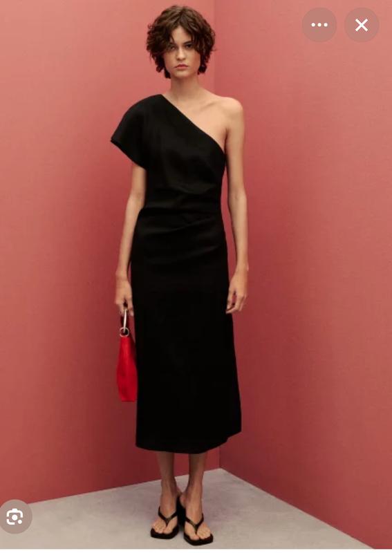 Лляна сукня на одне плече. Тканина якісна. Збоку на блискавці. Внизу розріз. Груди з одного боку переходить в рукав, щаміри по тканині 48, талія 39, стегна 50, довжина 129