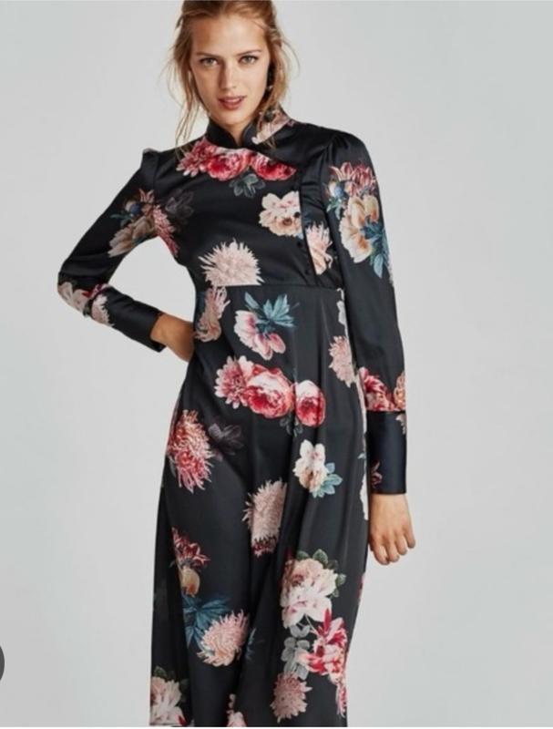 Шикарное новое атласное платье в цветочный принт ZARA.Паперовой бирки нет. Юбка на тонкой шифоновой подкладке.Красивые,высокие манжеты на пуговицах.В восточном стиле.Пог-49,Пот-41,длина-118-122
