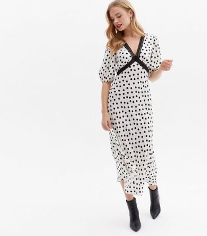 Сукня міді в горох стан ідеальний, віскоза, ззаду в талії рез+пояс, крій струмує р 18 ххл -довжина 130 -нОг 58-62 -нОт 42-55 ззаду рез. -нОб 64-69 ФОТО НА ТІЛІ НЕМАЄ