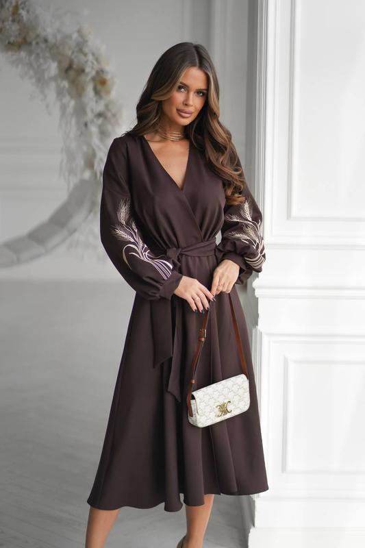 Платье на запах с вышивкой Модель 7507 Размер S (42),М (44),L (46), XL (48), XXL (50), 3XL (52) Тканина: костюмка Длина: 117 см Длина рукава: 67 см Цвета: зеленый, голубой, черный, молочный, шоколад 🍫 (NEW)