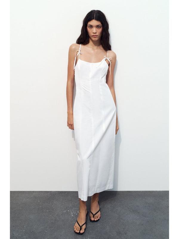 Габардиновое платье с круглым верхом и тонкими завязывающимися бретелями. Застегивается на скрытую молнию сзади и имеет подкладку в тон. Размер L: ✅НОГ - 45 см ✅ НОТ - 40 см ✅ НОС - 55 см ✅ Длина - 129 см ✅Состав: 100% хлопок. Подкладка: 80% полиэстер, 20% хлопок