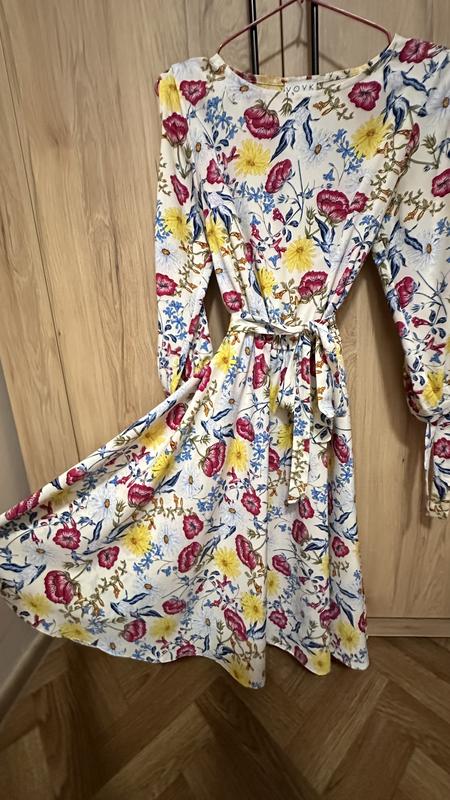 Ніжна літня сукня VOVK, зроблена в Україні 🌿 Білий фон із яскравим квітковим принтом — жовті, рожеві, сині й зелені відтінки створюють ефект свіжого весняного поля. Легка, приємна до тіла тканина. Сукня має пояс, що підкреслює талію, та рукави з розрізом і зав’язками, які додають романтичності. • Розмір: XXS, але вона чудово підходить на XS та S • Матеріал: віскоза (95%), еластан (5%) • Колір: білий із квітковим принтом • Бренд: VOVK • Стан: як нова, без плям і пошкоджень
