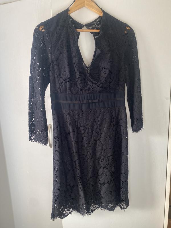 Чорна мереживна сукня від Tara Jarmon. Це сукня з довгими рукавами, мереживним оздобленням, вирізом-краплею на горловині та поясом на талії. Бренд Tara Jarmon відомий створенням жіночого одягу, який поєднує елегантність та витонченість. Такі сукні часто описують як вечірні або коктейльні. Довжина 93 Рукав 48 , пог 39см