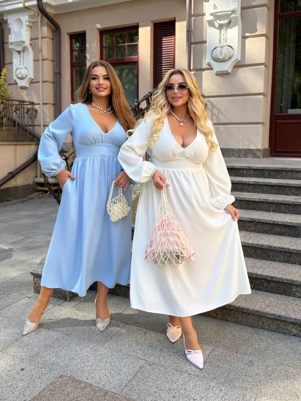 Платье миди с завязкой сзади больших размеров голубое молочное