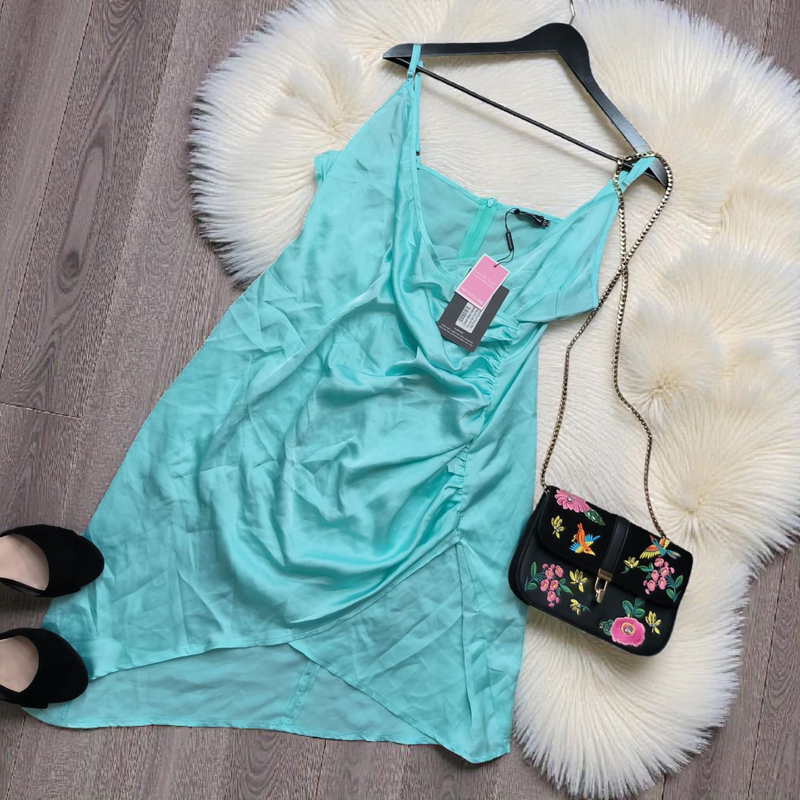 Бретели регулируются, сзади молния. Спереди запах, драпировка. Асимметрия