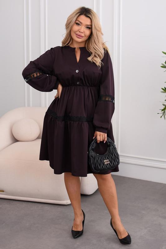 Сукня вільного крою з застібкою на ґудзики до талії. По лінії талії — м’яка резинка для комфортної посадки. Декор із мережива додає ніжності, сукня пасує до кросівок і чобіт, легко комбінується на щодень і на свято. 🔢 Модель: Мод: 542 🧵 Тканина: єврокостюмка, кружево 📏 Розміри: 48-50, 52-54, 56-58, 60-62 🎨 Кольори: чорний, шоколад, індиго, бутилка 📐 Фактичні заміри виробу: 🔹48-50 — ОГ 108 см • ОТ(вільно/розтягнуто) 82/112 • Довжина 103 см • Рукав 61 см • Біцепс 40 см 🔹 52-54 — ОГ 116 см • ОТ(вільно/розтягнуто) 90/120 • Довжина 103 см • Рукав 61 см • Біцепс 41 см 🔹 56-58 — ОГ 124 см • ОТ(вільно/розтягнуто) 98/128 • Довжина 103 см • Рукав 62 см • Біцепс 42 см 🔹 60-62 — ОГ 132 см • ОТ(вільно/розтягнуто) 106/136 • Довжина 104 см • Рукав 62 см • Біцепс 43 см ℹ️ Примітка щодо посадки: Сукня вільна від талії ОС не враховувати, при виборі розміру необхідно враховувати вільний фасон виробу 👗 Дані моделі на фото: Зріст — 163 см • Одягнена в розмір 48-50 • Параметри 103-77-108 💎 Переваги: ✅ Вільний крій і м’яка резинка по талії — комфортна посадка протягом дня. ✅ Застібка на ґудзики до талії — зручно регулювати виріз і легко комбінувати з базовими речами. ✅ Мереживний декор — ніжний акцент для повсякденних і святкових образів. ✅ Еврокостюмка — охайний вигляд і приємні тактильні відчуття.