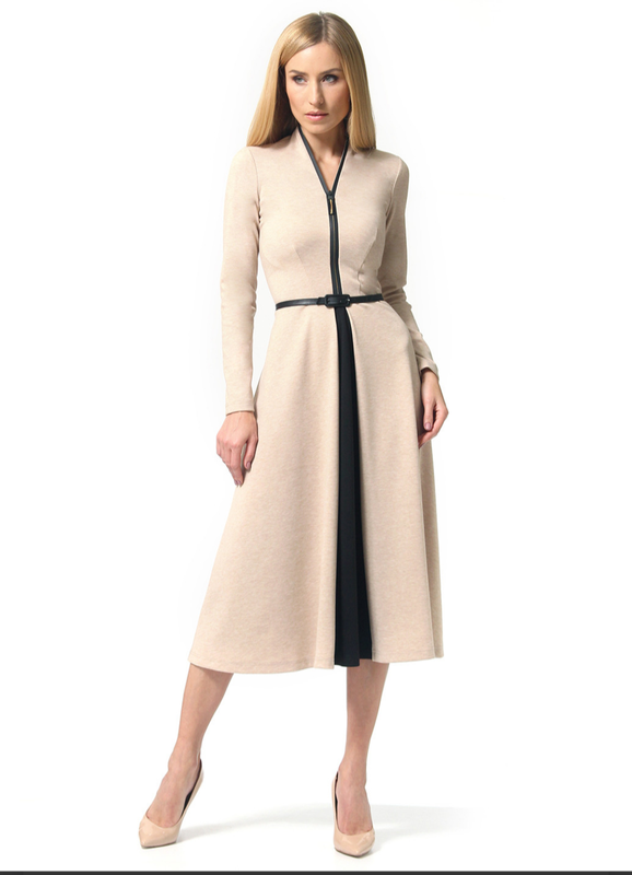 Сукня приталеного силуету з довгим рукавом, відрізне по лінії талії. За переду вироби з декоративною блискавкою, що переходить в комір. На спідниці переду зустрічна складу з контрастною склад, що гармоніює з блискавкою. 60% віскоза, 30% поліестер, 10% еластан