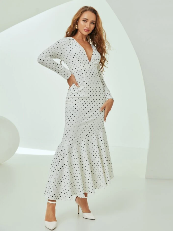 Платье русалка белое в горошек с асимметричным низом и глубоким вырезом shein