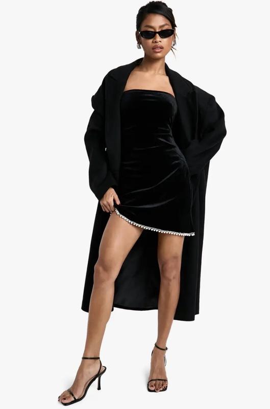 Опис Розкішна міні-сукня-бандо з оксамиту Ефектна оздоблена бісером деталь подолу Облягаючий силует для ефектного крою Дизайн без бретелей, що підкреслює плечі та зону декольте Універсальний виріб, що підійде для багатьох святкових випадків. Розмір 14, з бірками Заміри всередині ліфа немає, ширина під руками 42 см полуобхват + ще тягнеться, довжина 65 см