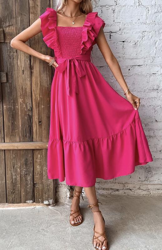 Вискозно-льняное платье сарафан миди цвета фуксии!!! По спинке ряды резинок для лучшей посадки по фигуре, бретели-крылышки, по низу оборка, завязки по талии можно завязывать спереди или сзади! Указан размер S, подойдет на S-M-L, ориентируйтесь на замеры: Длина от плеча - 117 см ПОГ - 44 см (тянется до 53 см) ПОТ - 43 см (тянется до 52 см) ПОБ - 61 см Фото на моделях иллюстративные 23–10-5