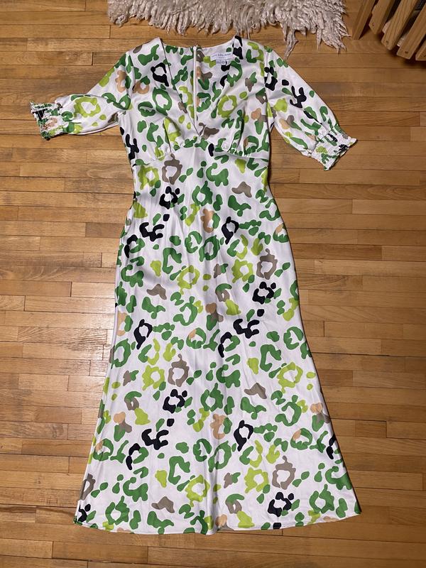 Красивий акцент на грудях Світла тканина з зеленими абстракціями Довжина міді Приталена сукня На застібці Зручно одягати Доповнить будь який образ