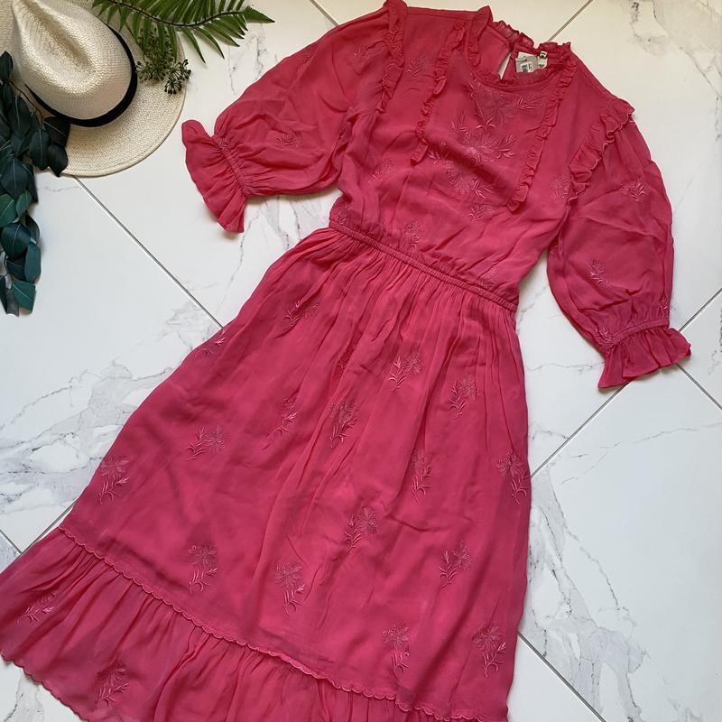 Сукня рожева міді стан ідеальний, віскоза на підкладці, вишивка, паперова бірка, трішки забруднилась під час транспортув. р 12 м -довжина 123, рук 44 -нОг 47-48 -нОт 35-44 -нОб 54 вільно ФОТО НА ТІЛІ НЕМАЄ