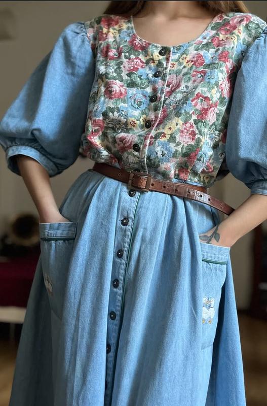 Чарівна вінтажна джинсова сукня міді з квітковим принтом та вишивкою Верх оздоблений яскравим квітковим принтом, застібається на ґудзики по всій довжині спереду. Рукави-ліхтарики ¾ довжини. Спідниця простора, зручна. Має дві кишені, що прикрашені милою вишивкою - пара качок з блакитними бантиками. Матеріал 100% бавовна. Розмір: XI-XXL, але можна на менший з поясом Довжина - 127 см Напівобхват груди - 63 см Напівобхват талія - 54 см В стегнах вільно Стан вінтажний, хороший, але є декілька малопомітних плямок, в око не кидається. Показала на фото Ремінець не йде в комплекті