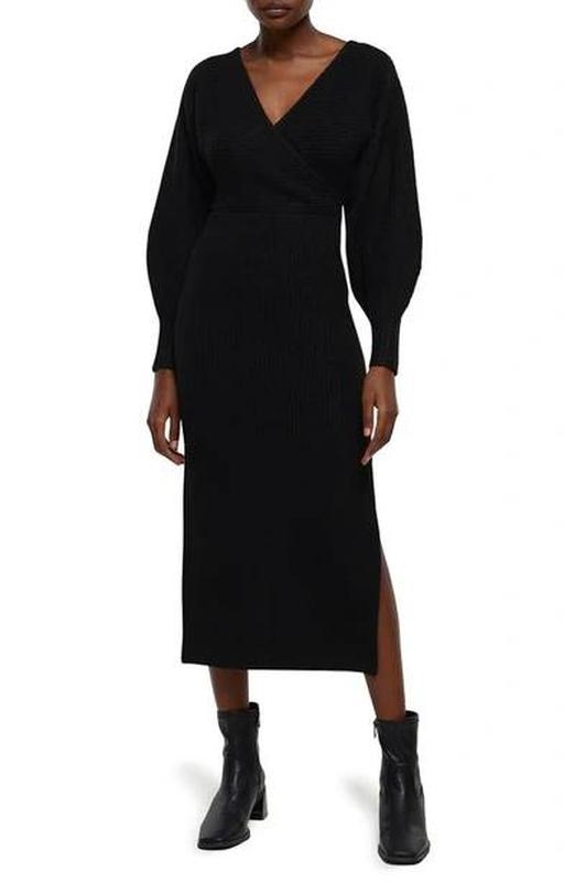 Платье миди на запаях из приятного к телу трикотажа. Модель с длинным рукавом и спущенной линией плеча. Акцентные боковые разрезы. Новая с бирками Цвет Черный Вязаное платье-свитер имеет облегающую тарелку и прямую юбку, спущенные плечи и структурированные пышные рукава. Носите это платье миди с изысканными ботфортами или парой удобных кроссовок.