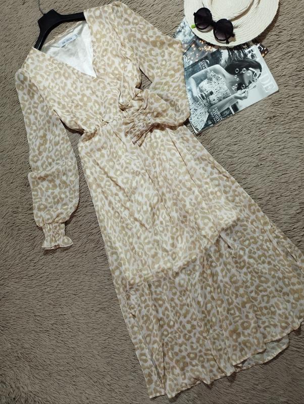 В идеальном состоянии. Красивое платье миди леопард с объемными рукавами. Ткань легкая, есть подкладка, не тянется. Размер 8/36/S, но смотрите по замерам Замеры (полуобхват): Грудь 49 Талия 31 (тянется до 46) Стегна 59 Рукав 61 Длина от плеча 122