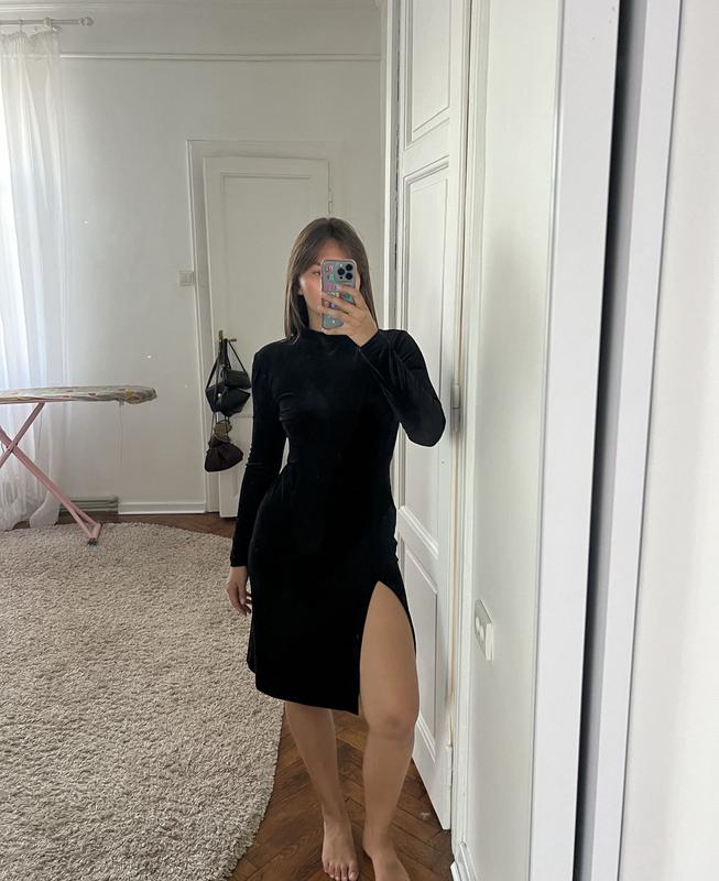 Сукня з велюру, з маленькою горловиною та розрізом на нозі У мене зріст 174, розмір М, деякі речі ношу С Шила під замовлення, тому без бренду Застібається замком + зверху є гудзики на шиї Стан супер, одягала декілька разів без дефектів