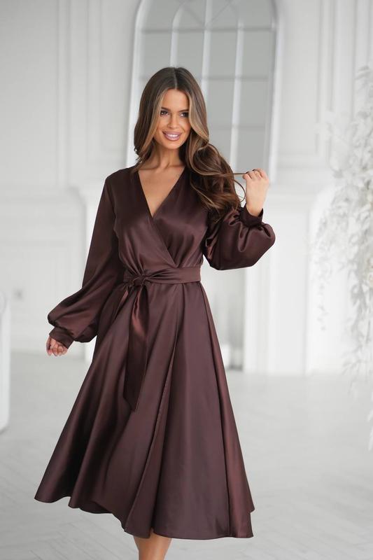 ✨ Атласна сукня на запах — модель 7563 ✨ 📏 Розміри: S–M (42–44) L–XL (46–48) 2XL–3XL (50–52) 👗 Тканина: атлас «Скарлет» 📐 Довжина сукні: 117 см ✋ Довжина рукава: 67 см 🎨 Кольори: зелений, чорний, молочний, шоколад, червоний 💃 Ця модель створена, щоб підкреслити фігуру та подарувати відчуття розкоші. Глибоке V-подібне декольте в поєднанні із запахом м’яко акцентує лінію талії, а пояс додає силуету витонченості. Довгі рукави з манжетами надають образу ніжності, а струмлива тканина красиво грає на світлі, створюючи ефект дорогоцінного шовку. ______________________________________ ✨ Деталі моделі: • Тканина: щільний атлас преміум-класу • Фасон: сукня-запах із поясом • Довжина: міді • Рукав: довгий, з об’ємними манжетами • Посадка: акцент на талії