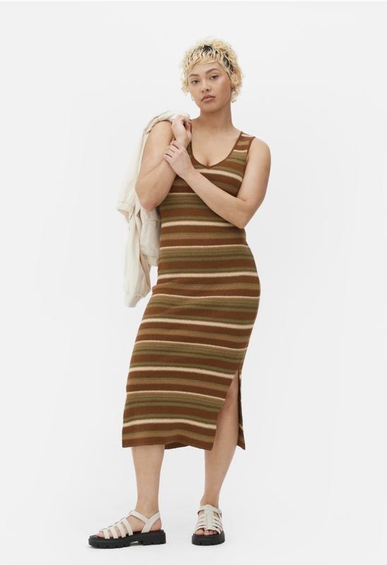 Сукня у смужку в актуальних коричнево-зелено-бежевих кольорах, стан дуже гарний, без дефектів. Універсальна сукня сарафан, яка впишеться як в зимовий, так і весняно-осінній гардероб, і на підійде на прохолодний літній вечір. Розмір зазначено S, тканина добре тягнеться. Пог-36 см Пот-30 см Поб-40 см Довжина 121 см