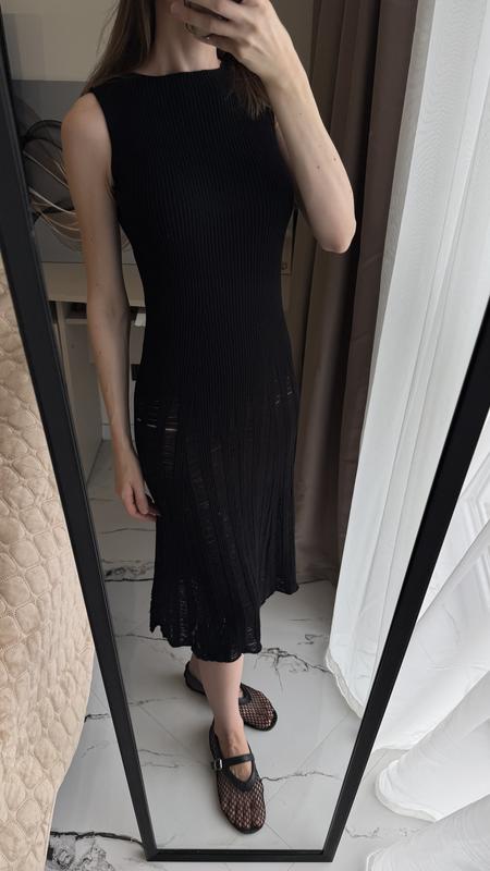 Трикотажна сукня, українського бренду (назву не пригадую). Дуже красива, гарний трикотаж - мʼягкий. Від бедр має перфорації - виглядає класно і стильно. Тільки мені по зросту не підходить. На фото зріст 170, краще сяде на 160-165 см. Єдиний маленький брак - останнє фото. Він не помітний при носінні. Одягнула 1 раз, продаю бо коротка мені. Довжина 107 см З перфораціями - 60 см