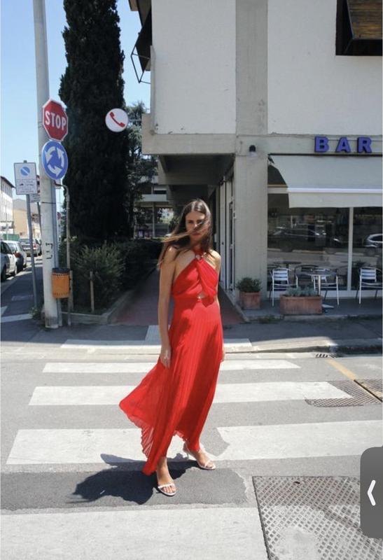 Нова з бірками яскрава червона сукня з підкладкою від Zara, коміром хальтер, золотистою пряжкою та відкритою спиною. Застібається на приховану блискавку ззаду. Виріз на грудях. РОЗМІР М: ✅ НОТ -38 см ✅ НОБ -55-63 см (по підкладці) ✅ Довжина - 125 см ✅Склад: 100% поліестер. Підкладка: 100% поліестер