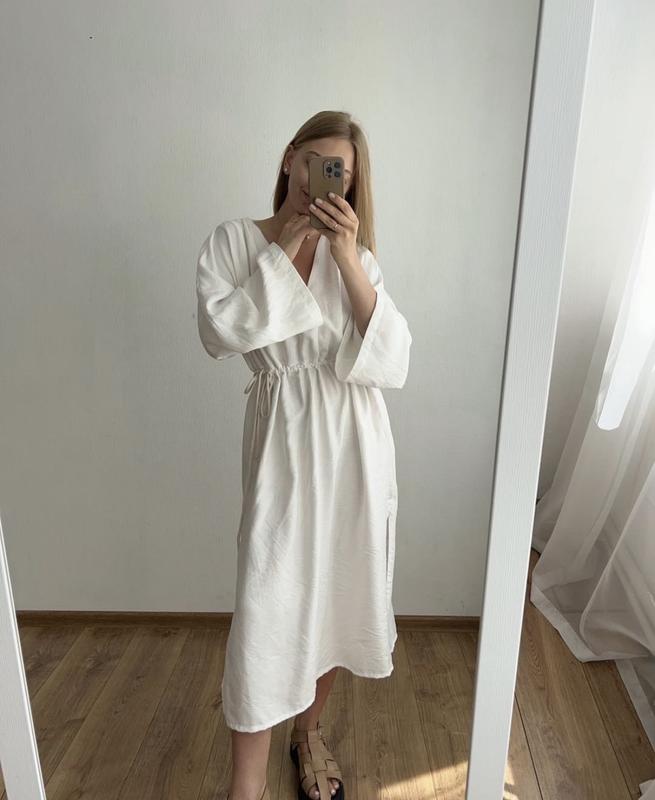 Сукня міді на кулісці від українського бренду zakhvat.studio ( колишній krasivo pokupat) Молочний колір Тканина легка, фактурна, мʼяка, у складі є віскоза, не світить По бокам є розпірки, в талії регулюється під себе Довжина 118 Максимальний ПОТ 48 см Сукня як нова, без дефектів