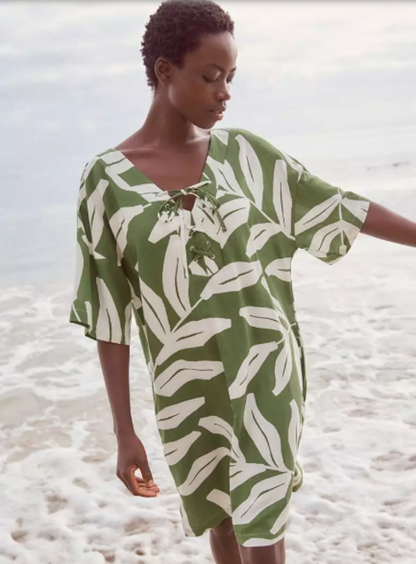 Платье-кафтан Размер L Замеры: ПОГ - 54/55; п/о бедер - 56/57; рукав от горловины -35; длина - 90 см; Карманы в боковых швах; Материал: 57% Livaeco™ Viscose, 37% Cotton, 6% Linen
