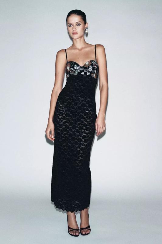 Сукня з вирізом-сердечком та тонкими регульованими бретелями. Деталі вишивки з контрастними паєтками. Тканина з мереживом. Низ хвилястої форми. ЧОРНИЙ | 5070/453/800