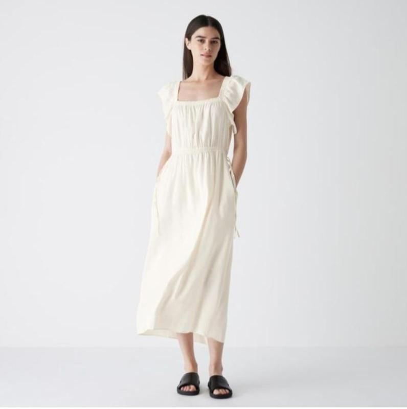Платье премиальной линии Uniqlo C Замеры общая длина от плеча спереди 120, пог 47, пот 36 ( резинка), бедра свободно. По бокам карманы. Взади оригинальный вырез. Есть шнуровка. Можно оставлять завязки по бокам, или же завязать как пояс