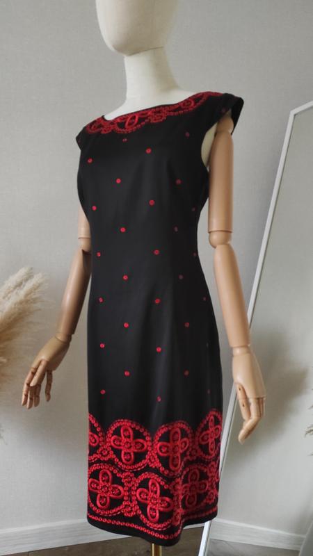 красивое черное платье с вышивкой на подкладке отличный состав, матовая атласная ткань размер производителя 12/40 крой футляр, слегка приталенный ▪️длина по спинке 91 см ▪️пог46 см ▪️пот 40 см ▪️пос 48 см