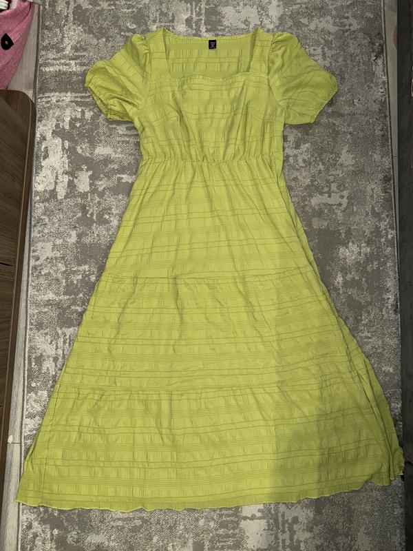 Жіноча сукня міді салатового кольору з квадратним вирізом, короткими рукавами-ліхтариками та багатоярусною спідницею. Довжина 129 см