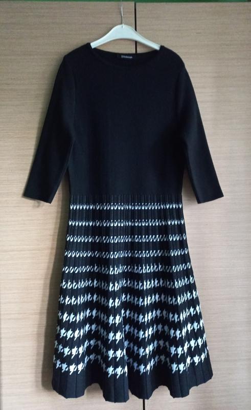 Склад тканини: 50% котон, 50% акрил. Цвет черный, юбка черная с белым. НО 46 см, нот 38 см, ноб 52 см, длина рукава 44 см, плечи 40 см, длина платья по спинке 110 см. Платье очень красивое, подойдет как в офис, так и на выход. Можно носить с пояском. Трикотаж очень качественный, плотный. Состояние идеальное, недостатков нет.