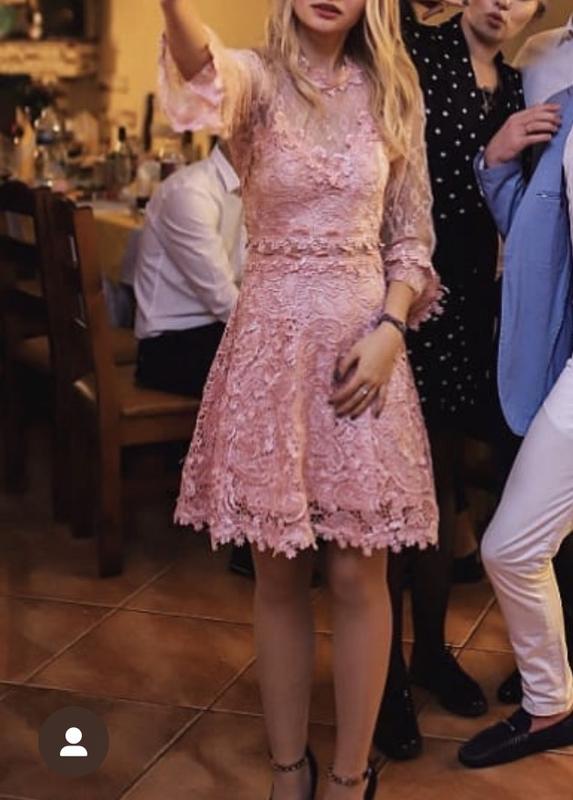 Плаття блідо-рожеве, пудра, ажурне. Довгі рукава, до коліна на зріст 165 см.