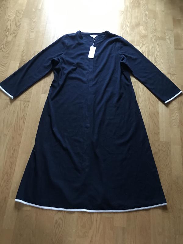 Сукня джерсі M&S, розмір 22 (приблизно XL-XXL, орієнтуйтеся на виміри ). Без підкладки не світиться. А-силует, рукави трохи розкльошені. На рукавах та по низу сукні біле оздоблення. Виміри: напівоб'єм під рукавами 61 см, стегон 64-65 см, довжина 125 см. Склад тканини: 61% п/е, 32% віскоза, 7% еластан. Делікатне прання 40 градусів