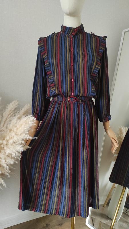 винтажное платье 80-х гг добре збереглася присутствует пояс длина по спинке 110 см ПОГ 49 см ПОТ 37-40 см плечи 39 см рукав от плеча 45 см вискоза средняя плотность без подкладки размер производителя 16, советовать ориентироваться на замеры