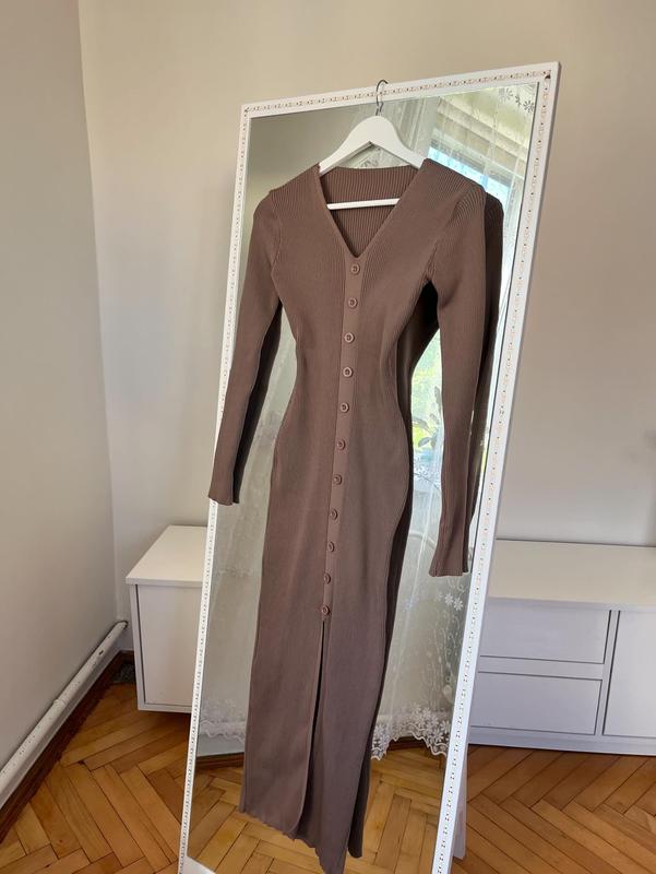 Сукня міді з довгими рукавами та V-подібним вирізом. Вона має ряди ґудзиків спереду по всій довжині, що додає їй елегантності та зручності Колір — теплий відтінок коричнево-бежевого (мокко). У нижній частині сукні є розріз спереду, який робить образ більш жіночним