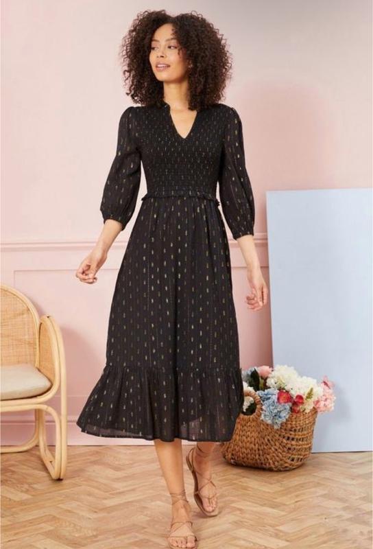 Стильна святкова чорна сукня міді з золотими вставками Love & Roses Розмір 18 Стан ідеальний Довжина 127 ПОГ 54 тягнеться 78 ПОТ 48 тягнеться 65 ПОБ 70 Верх 97% бавовна, 3% люрекс Підкладка 100% бавовна